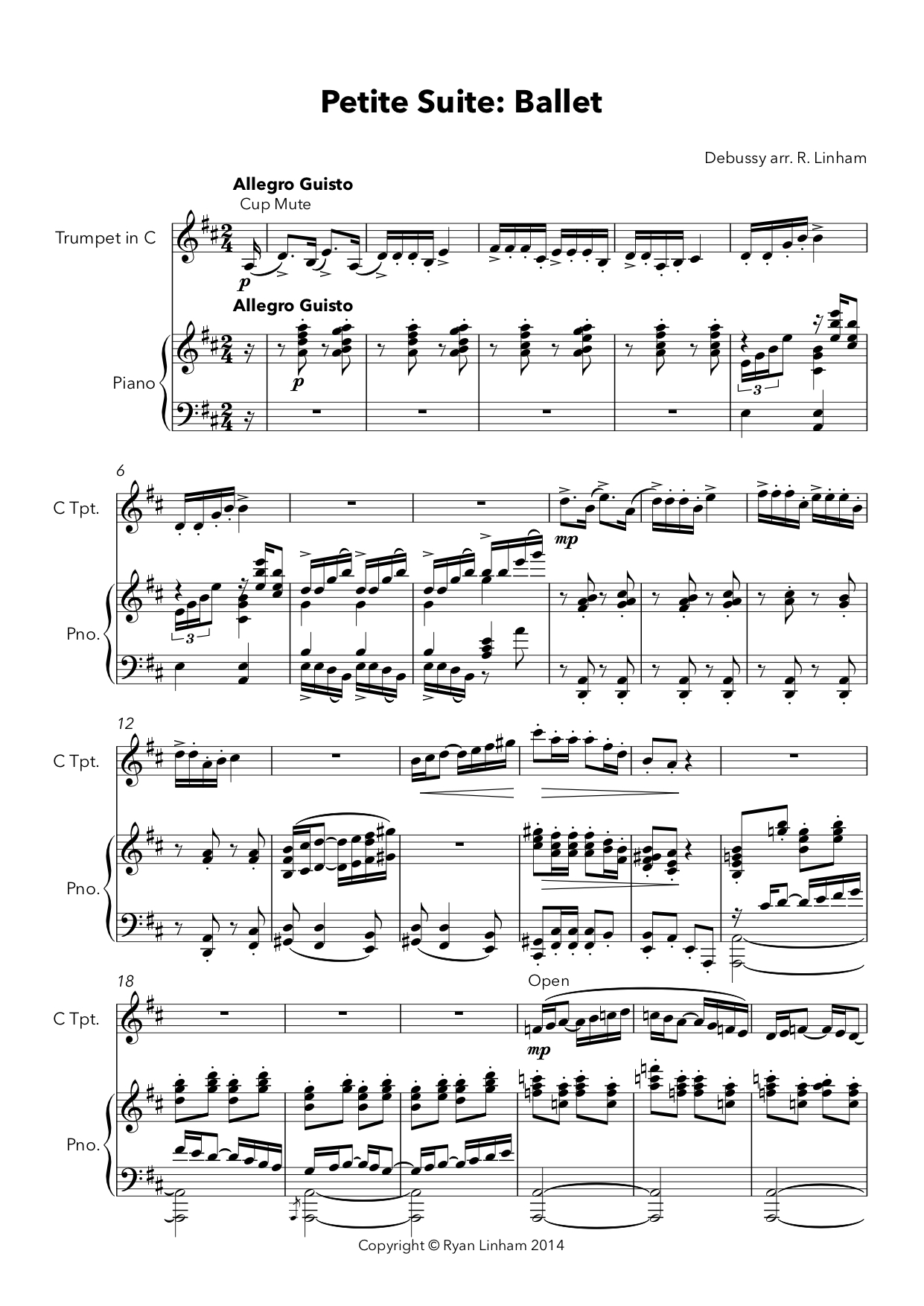 The original Petite Suite was composed in 1889 for piano 4-hands. This arrangement for Trumpet and Piano is a lively party piece with all the typical elements of Debussy’s impressionist style and harmony. There is plenty of room for expression within the work, which is a delight to play with technical challenges too.