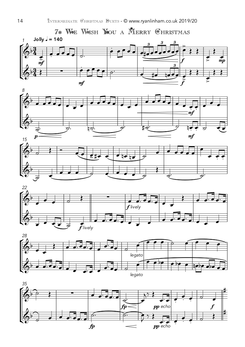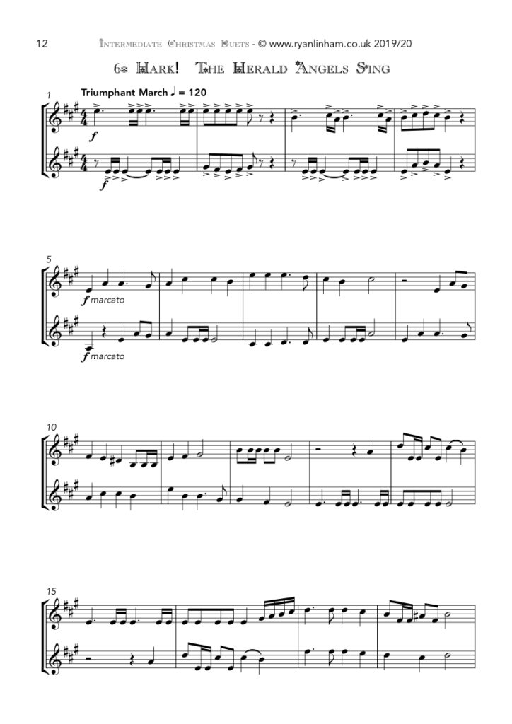 This collection of 10 fresh duets is specifically aimed at brass players at the intermediate grade level. They are perfect for older students to really test their sight reading with fun versions familiar tunes, but also younger players looking for a Christmas item to spend time learning from week to week. I am careful in these quirky arrangements to keep the range relatively low (no higher than Gs or As) to keep the challenge more musical than physical.
