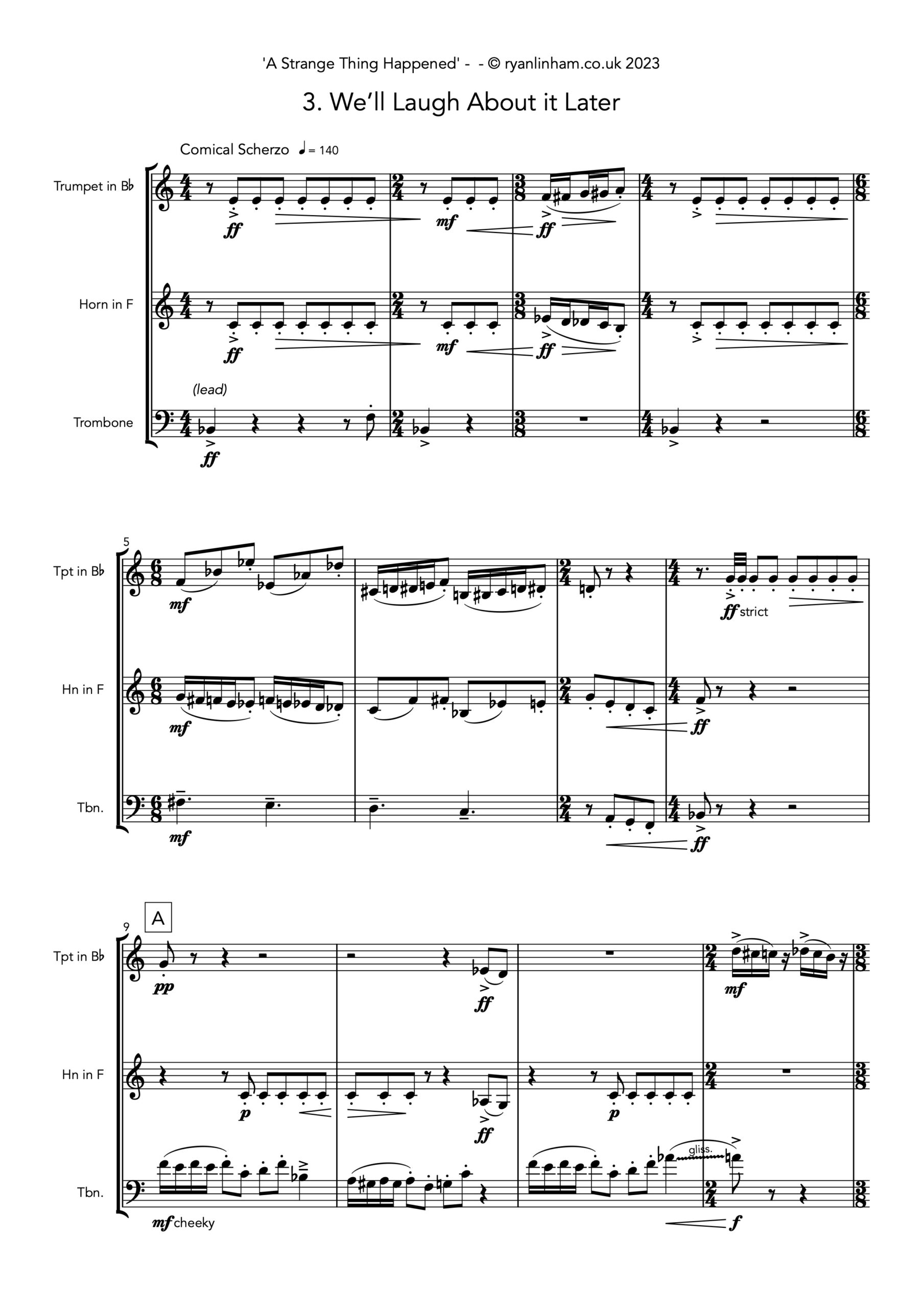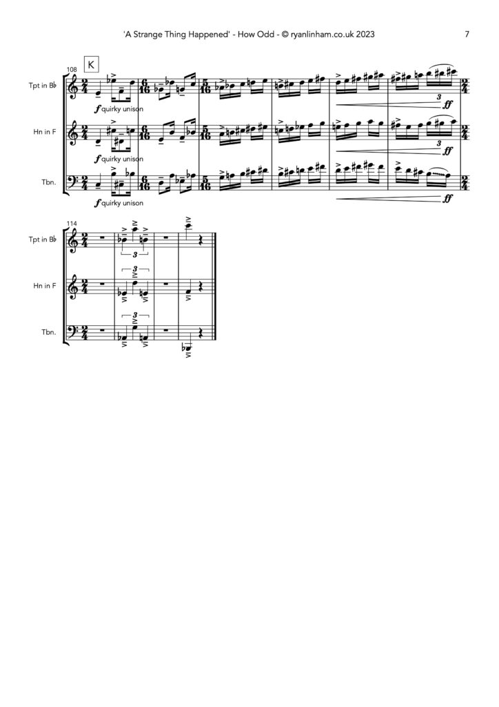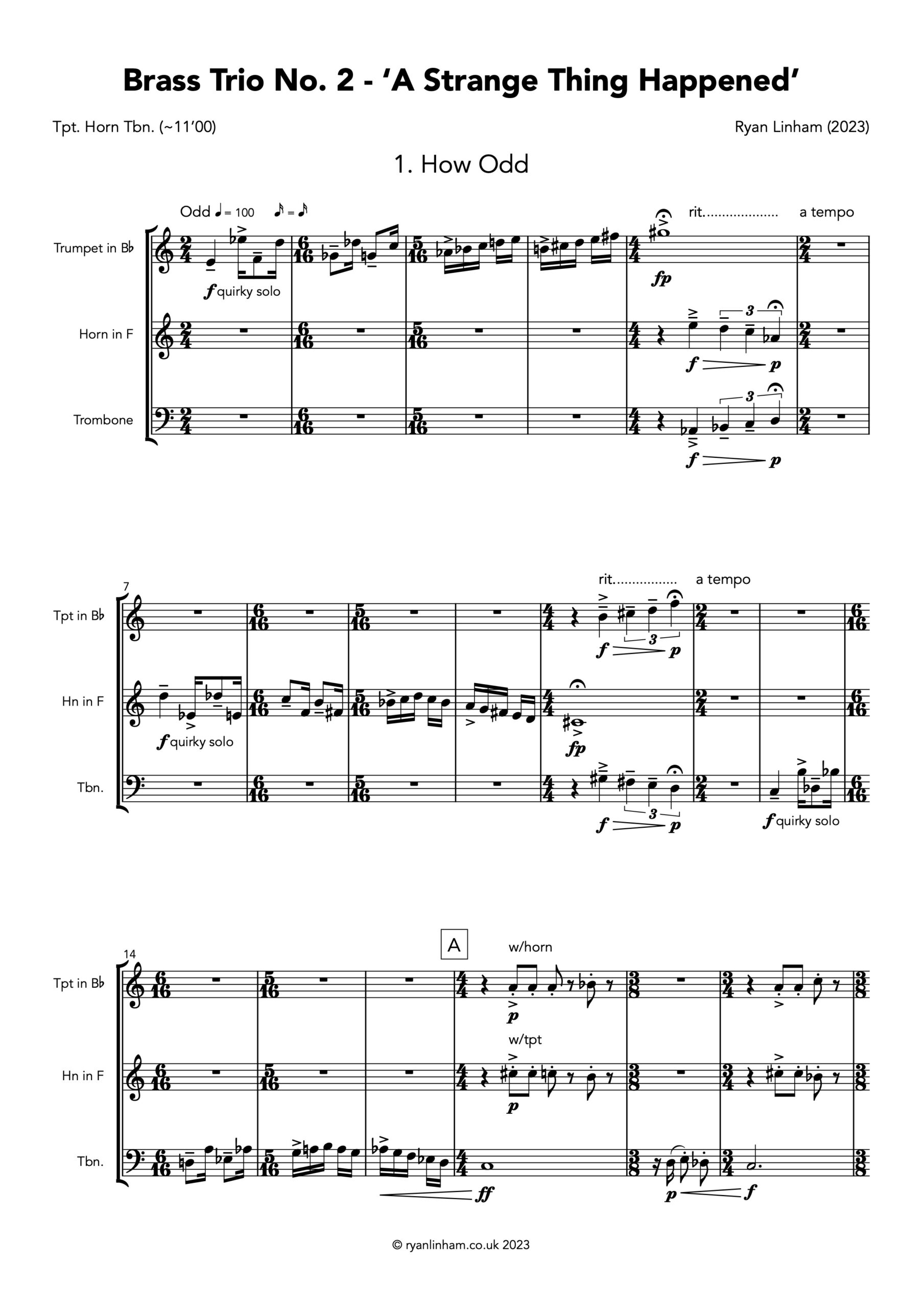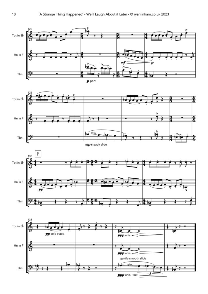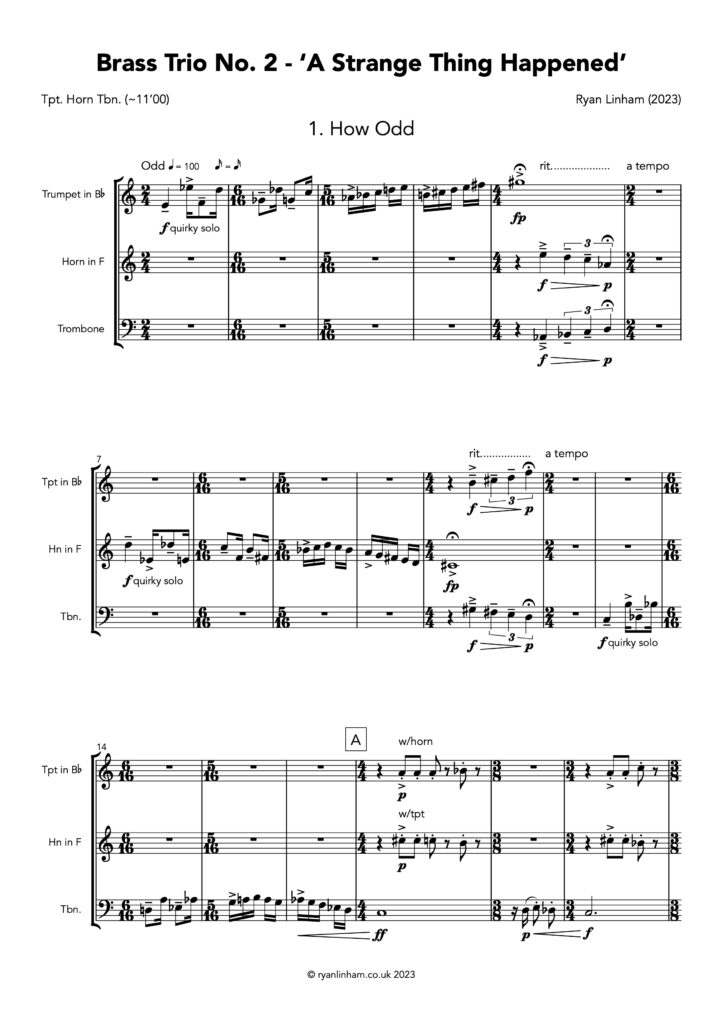 ‘A Strange Thing Happened’ is a quirky and delightful Brass Trio written in 2023 from multiple fragments of discarded compositions in my back catalogue. Writing this piece began as a personal practice exercise, fortunately the strength of the concept and music quickly snowballed into fully formed themes, developments and movements.