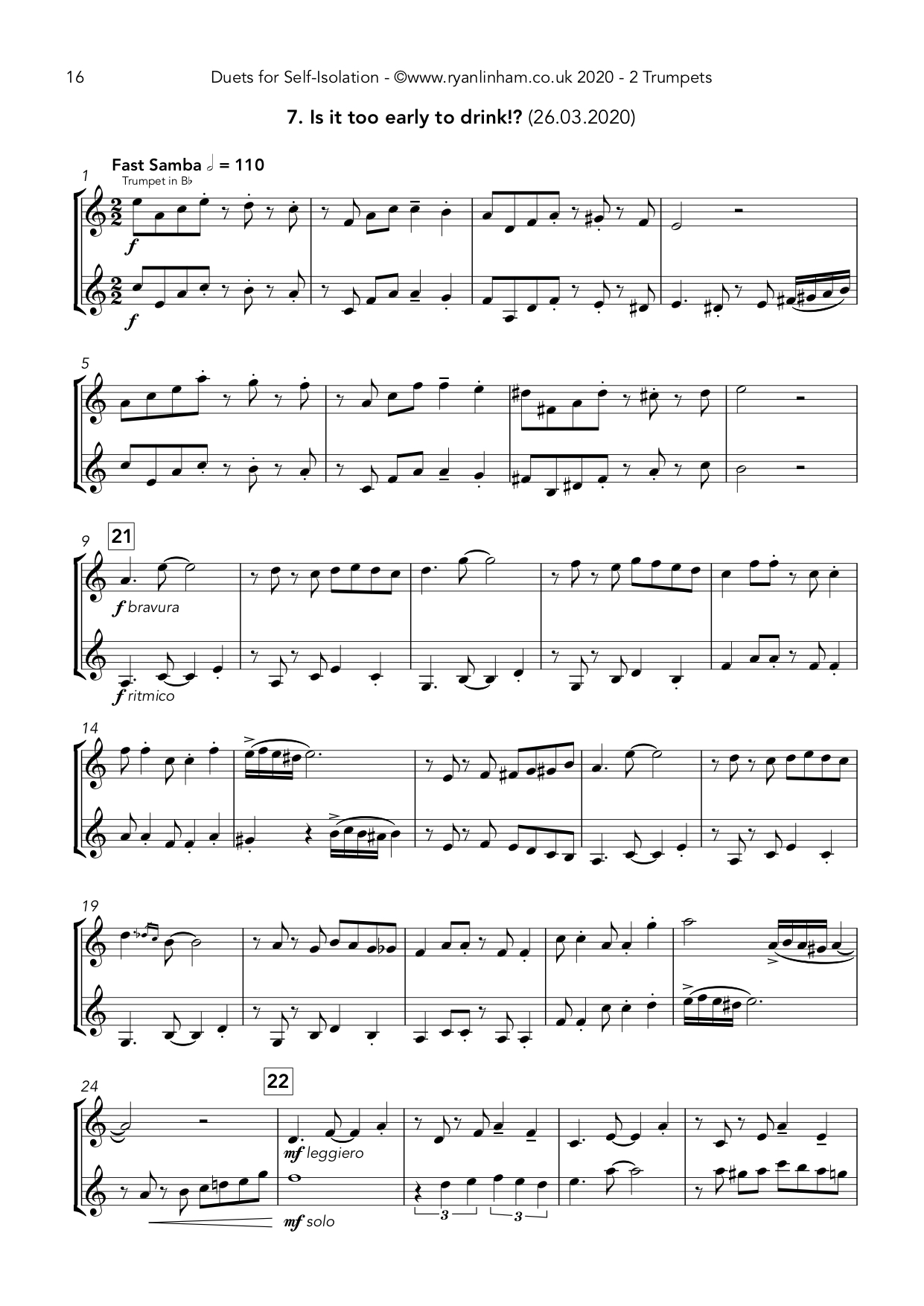 07.05.2022 These are now adapted for Trumpet+Flute, 2 Trumpets, 2 Clarinets, Trumpet+FHorn, Trumpet+Clarinet, Trumpet+Violin, Trumpet+Viola, Oboe+Clarinet, Flute+Snare Drum – get in touch if you want your instrumentation!